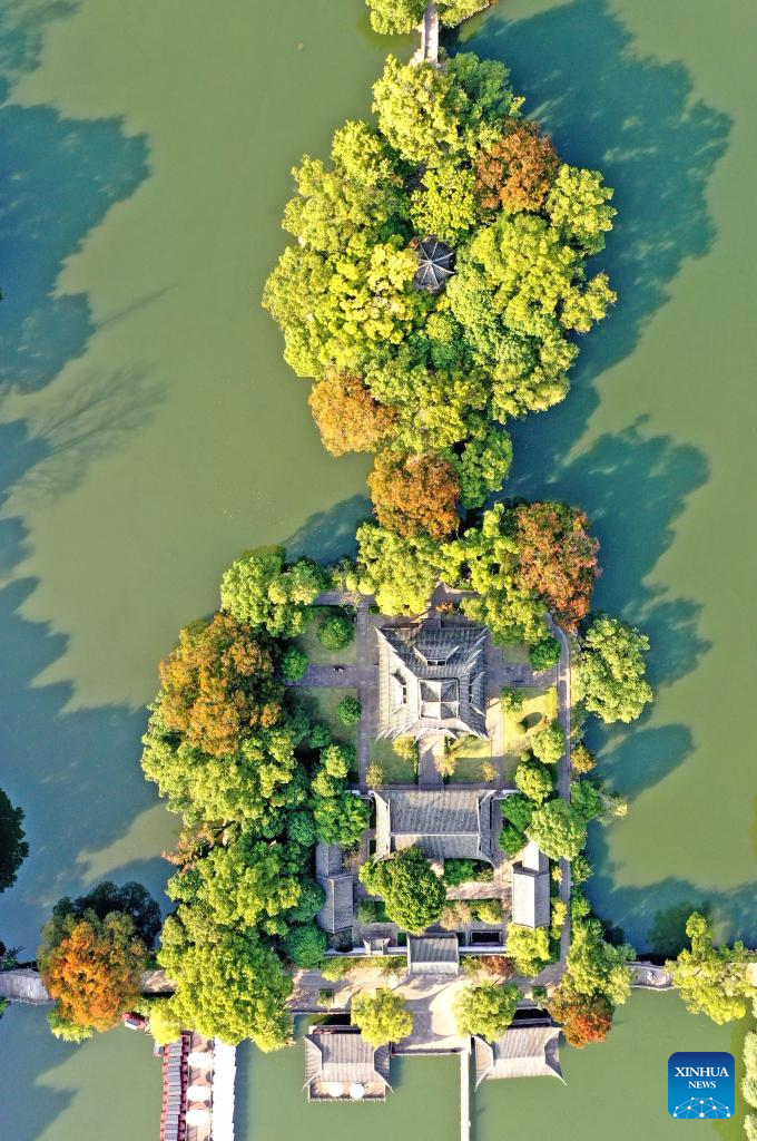 This aerial photo taken on Oct. 30, 2023 shows the autumn view of Donghu Lake in Linhai City, east China's Zhejiang Province. (Photo by Wang Huabin/Xinhua)