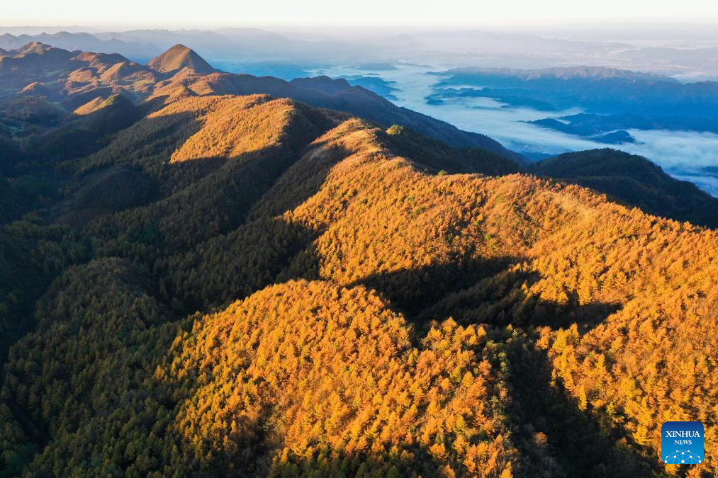 This aerial photo taken on Nov. 1, 2023 shows the autumn view of Jinqiansong Park of Anji County, Huzhou City, east China's Zhejiang Province. (Photo by Xia Pengfei/Xinhua)