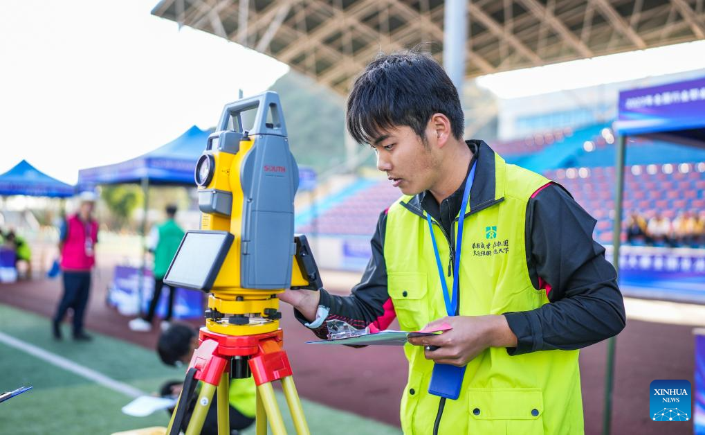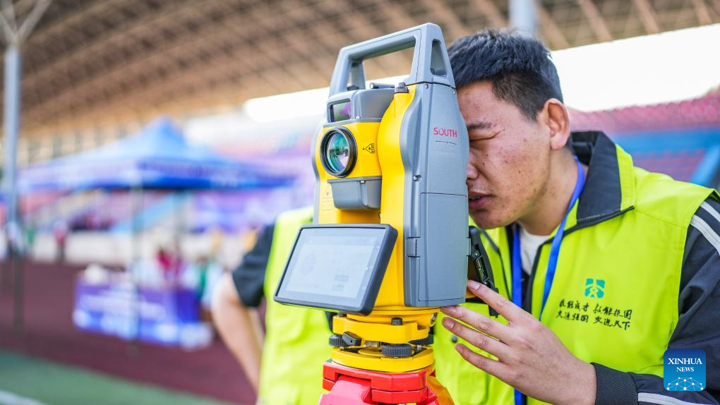 A contestant competes in construction layout event during a national bridge and tunnel engineering vocational skills competition in Guiyang, southwest China's Guizhou Province, Nov. 1, 2023. A national bridge and tunnel engineering vocational skills competition kicked off here Wednesday. In total 214 contestants from 85 teams across China would compete in the four-day competition involving events like processing of framework of reinforcing steel bars and construction layout. (Xinhua/Tao Liang)