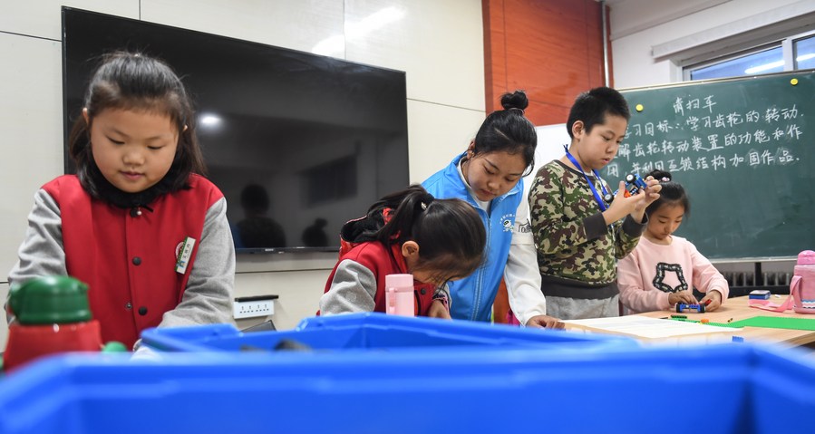 A college student tutors children in building models under a start-up project of Xizang Minzu University in southwest China's Tibet Autonomous Region, on Oct. 11, 2019. In 2019, Tibet created more than 60,000 jobs for university graduates by improving employment policies and services. (Xinhua/Jigme Dorje)