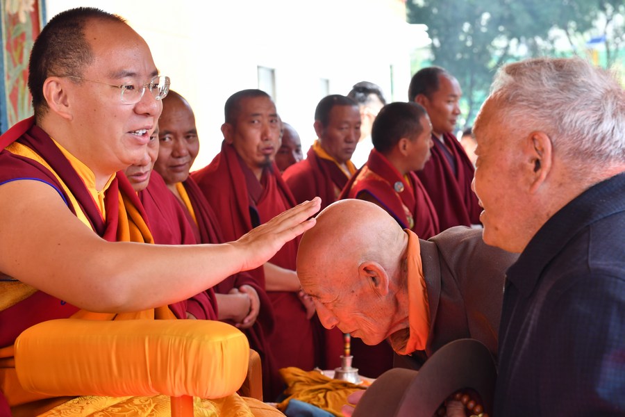 Panchen Erdeni Chos-kyi rGyal-po gives head-touching blessings to a believer in Lhasa, southwest China's Tibet Autonomous Region, July 17, 2023. (Photo by Chogo/Xinhua)