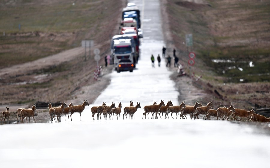 A group of Tibetan antelopes pass through the Qinghai-Tibet Highway and head towards the Sanjiangyuan area in northwest China's Qinghai Province, July 28, 2023. (Xinhua/Zhang Hongxiang)