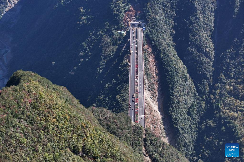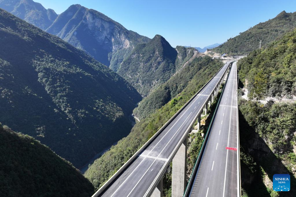 This aerial photo taken on Nov. 1, 2023 shows a section of the construction site of the Wuxi-Zhenping Expressway in northwest China's Shaanxi Province. Connecting Zhenping County of Shaanxi Province with Wuxi County of Chongqing Municipality, the 48.7-kilometer Wuxi-Zhenping Expressway is expected to be officially put into operation before New Year's Day in 2024. (Xinhua/Shao Rui)