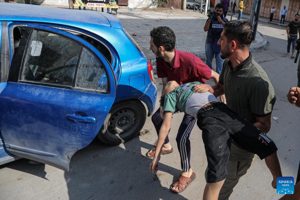 People transfer a man injured in an Israeli airstrike in Gaza City, on Nov. 2, 2023. The Israel-Hamas conflict, raging for nearly a month, has led to the deaths of more than 9,000 Palestinians in Gaza. On the Israeli side, more than 1,400 people lost their lives, the vast majority in the Hamas attack on Oct. 7, which triggered the latest conflict. (Xinhua)