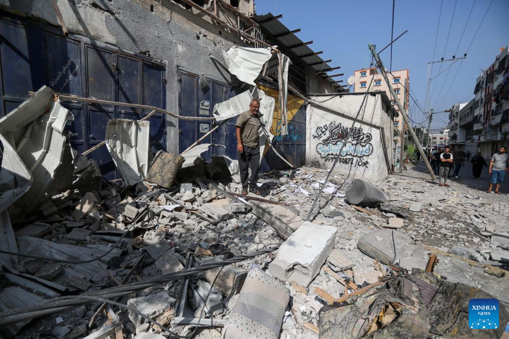 People inspect the damage after Israeli airstrikes in Gaza City, on Nov. 2, 2023. The Israel-Hamas conflict, raging for nearly a month, has led to the deaths of more than 9,000 Palestinians in Gaza. On the Israeli side, more than 1,400 people lost their lives, the vast majority in the Hamas attack on Oct. 7, which triggered the latest conflict. (Xinhua)