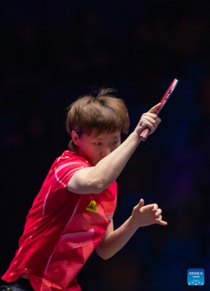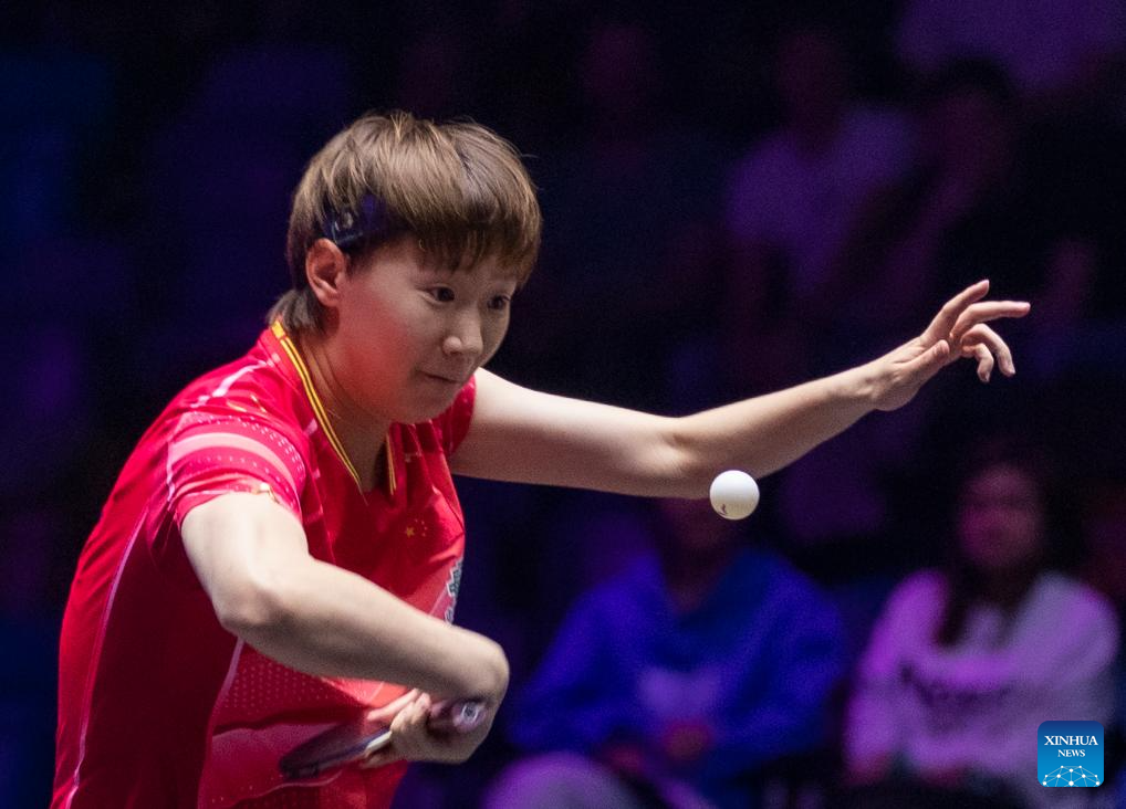Wang Manyu of China hits a return during the women's singles round of 16 match against Yuan Jianan of France at the WTT Champions Frankfurt 2023 in Frankfurt, Germany, Nov. 2, 2023. (Xinhua/Zhang Fan)