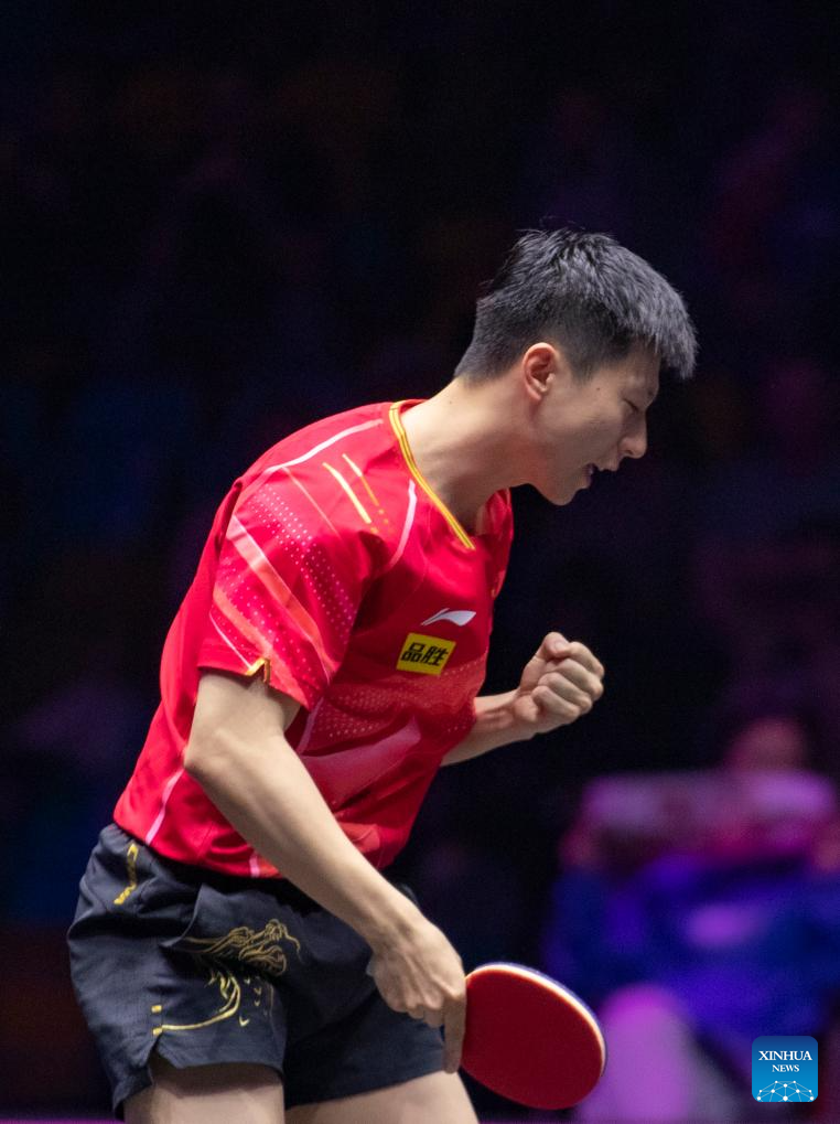 Ma Long of China celebrates during the men's singles round of 16 match against Omar Assar of Egypt at the WTT Champions Frankfurt 2023 in Frankfurt, Germany, Nov. 2, 2023. (Xinhua/Zhang Fan)
