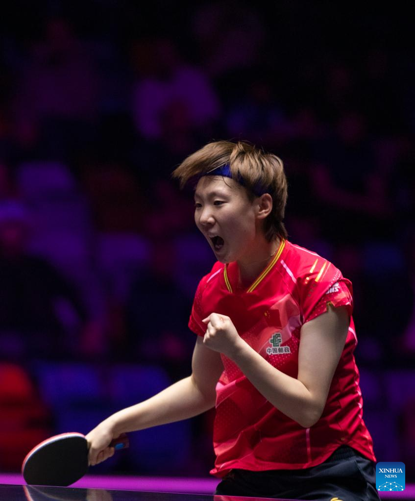 Wang Manyu of China celebrates during the women's singles round of 16 match against Yuan Jianan of France at the WTT Champions Frankfurt 2023 in Frankfurt, Germany, Nov. 2, 2023. (Xinhua/Zhang Fan)