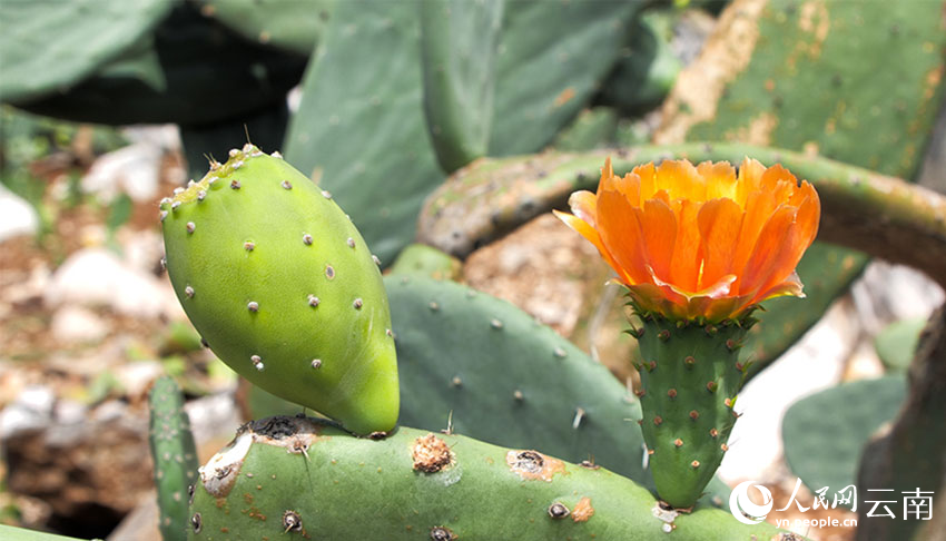 Photo shows a cactus fruit and flower. (Photo/Wang Hongqiu)