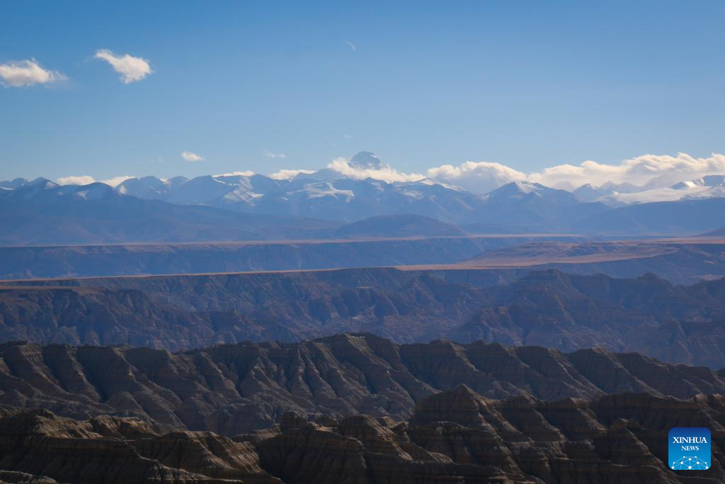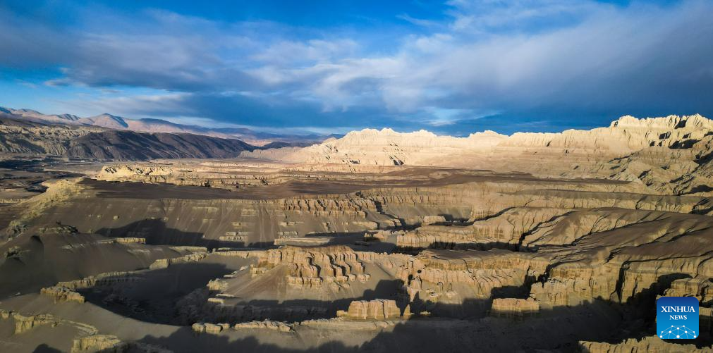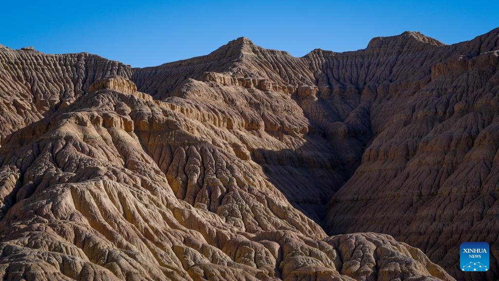 This photo taken on Nov. 2, 2023 shows the landscape of earth forest in Zanda County of Ngari Prefecture, southwest China's Tibet Autonomous Region. Zanda is famous for the unique landscape of earth forest. With gullies, ravines and steep mountainsides, the unique landscape was shaped as a result of gradual geological movements of the Himalayan region ever since the Quaternary Period from 2.5 million years ago and the impact of perennial water erosion and airslaking. (Xinhua/Chen Shangcai)