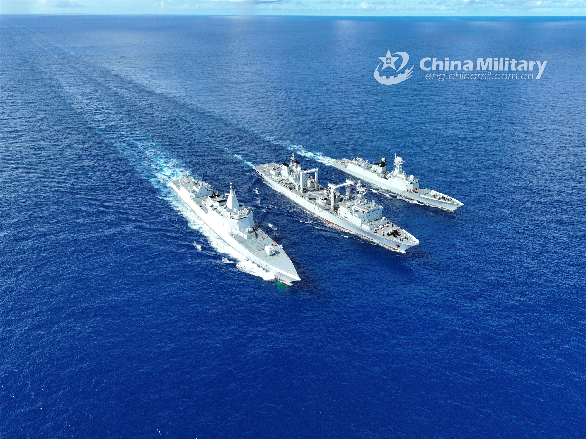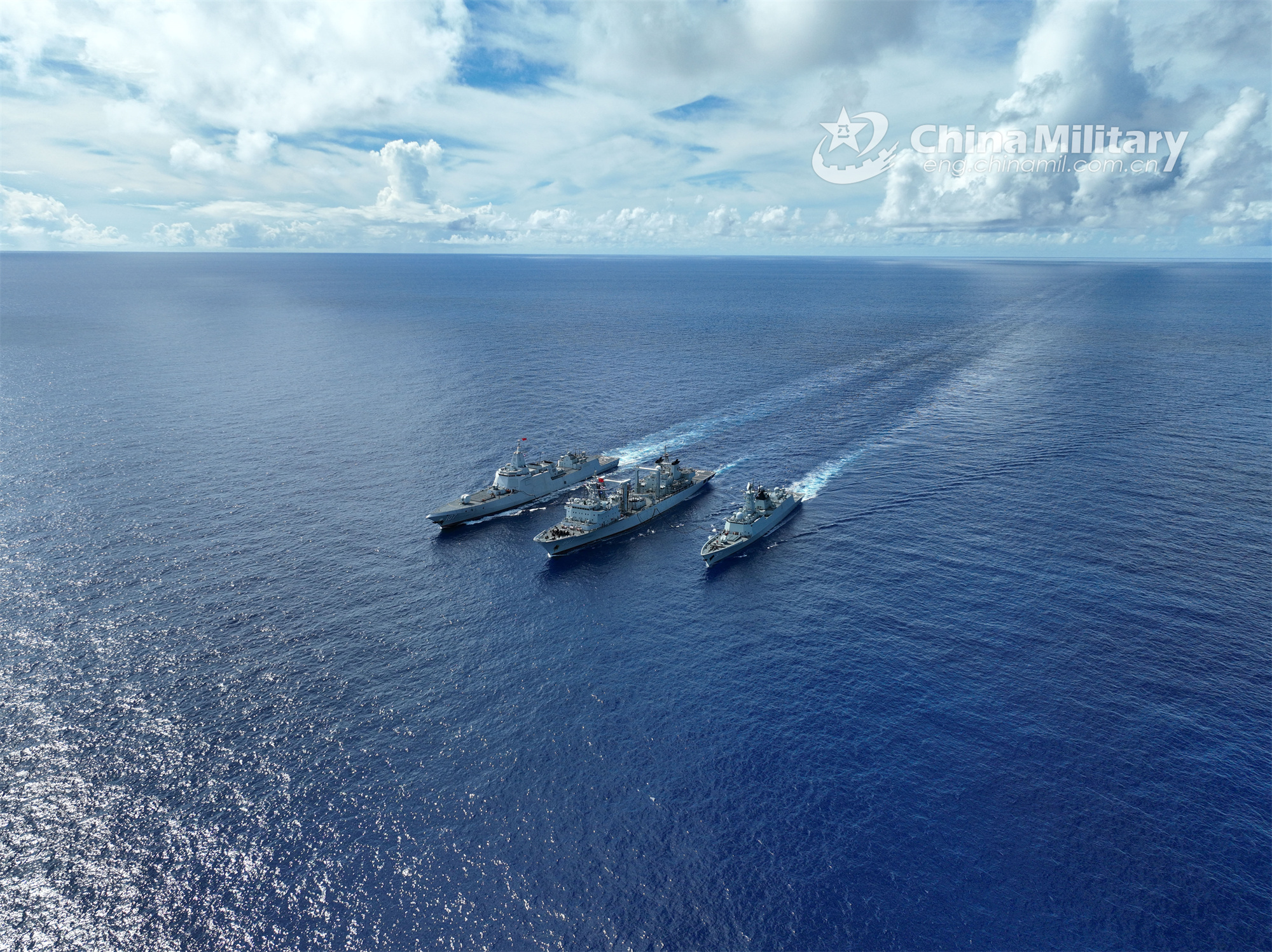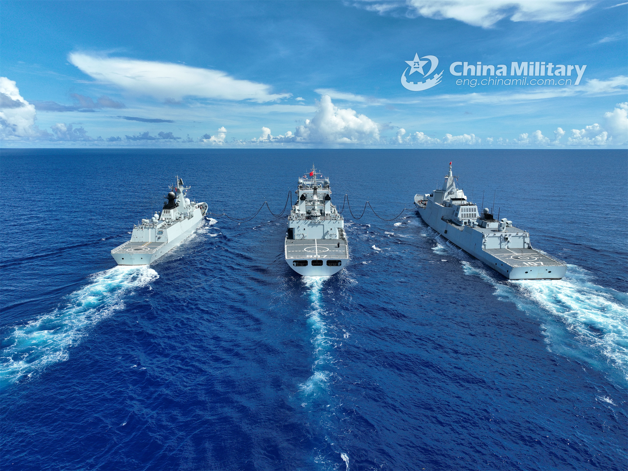 Warships attached to a combat support ship flotilla of the navy under the PLA Southern Theater Command perform alongside replenishment at sea during a combat training exercise on October 23, 2023. (eng.chinamil.com.cn/Photo by Yin Zhenzhou)