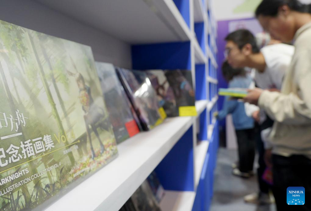 Comic enthusiasts select comic products during the 19th World Comic Conference in Anyang, central China's Henan Province, Nov. 4, 2023. The five-day 19th World Comic Conference kicked off here on Saturday with 2,931 comic works from 29 countries and regions on display. (Xinhua/Li Jianan)
