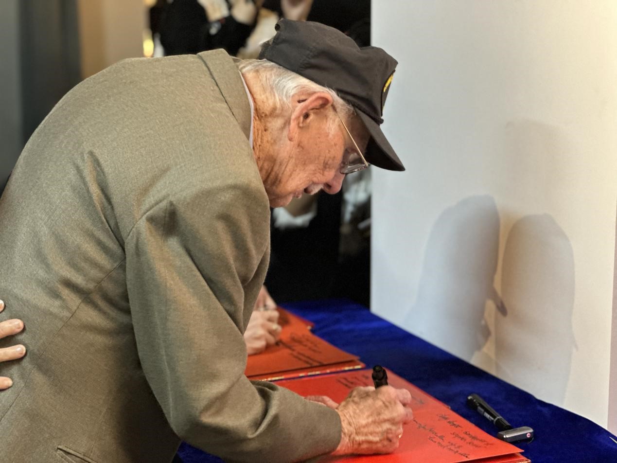 Flying Tigers veteran Mel McMullen signs his name on a guestbook at the Stilwell Museum in southwest China's Chongqing municipality. (People's Daily/Liu Lingling)
