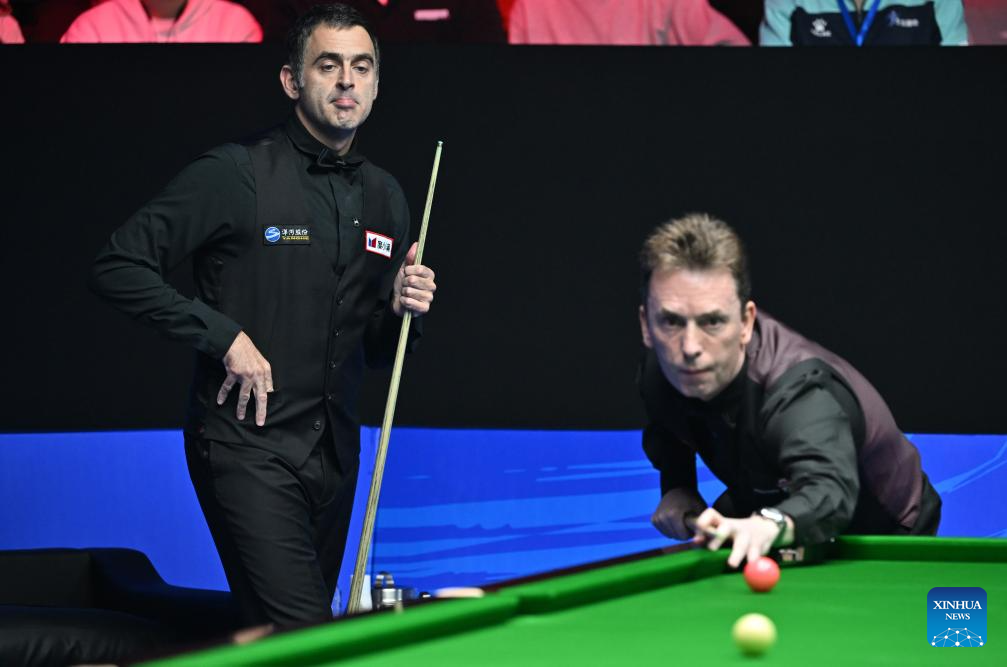 Ronnie O'Sullivan (L) of England reacts during the round 1 match between Ronnie O'Sullivan of England and Ken Doherty of Ireland at World Snooker International Championship 2023 in north China's Tianjin Municipality, Nov. 5, 2023. (Xinhua/Li Ran)