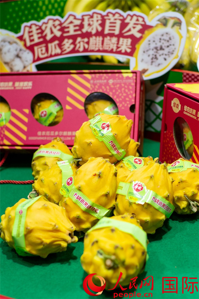 Photo taken on Nov. 5 shows yellow dragon fruit from Ecuador entering the Chinese market for the first time at the food and agricultural products section of the 6th China International Import Expo in Shanghai. (People's Daily Online/Weng Qiyu)