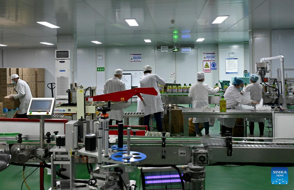 Workers pack linseed oil products at a bio-tech company at the Alataw Pass comprehensive bonded area in northwest China's Xinjiang Uygur Autonomous Region, Nov. 4, 2023. Located in the Mongolian Autonomous Prefecture of Bortala in Xinjiang, the Alataw Pass borders Kazakhstan. Since 2011 when the first China-Europe freight train passed through it, the pass has handled more than 30,000 trains to Central Asia or Europe. (Xinhua/Zhao Chenjie)
