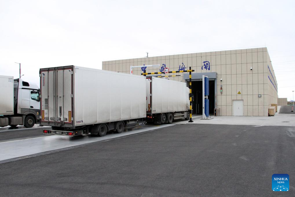 This photo taken on Nov. 4, 2023 shows the custom clearance center for the cross-border e-commerce of the Alataw Pass comprehensive bonded area in northwest China's Xinjiang Uygur Autonomous Region. Located in the Mongolian Autonomous Prefecture of Bortala in Xinjiang, the Alataw Pass borders Kazakhstan. Since 2011 when the first China-Europe freight train passed through it, the pass has handled more than 30,000 trains to Central Asia or Europe. (Xinhua/Li Xin)