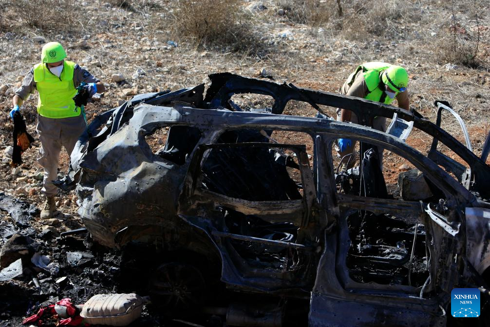 Paramedics check on the wreckage of a car that was bombed by an Israeli drone in Ainatha, Lebanon, Nov. 6, 2023. (Photo by Ali Hashisho/Xinhua)