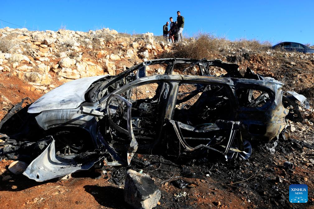 Local residents stand by the wreckage of a car that was bombed by an Israeli drone in Ainatha, Lebanon, Nov. 6, 2023. (Photo by Ali Hashisho/Xinhua)