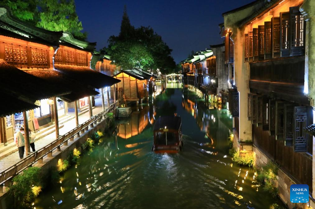 This photo taken on Nov. 7, 2023 shows a night view of river town Wuzhen, east China's Zhejiang Province. (Xinhua/Huang Zongzhi)
