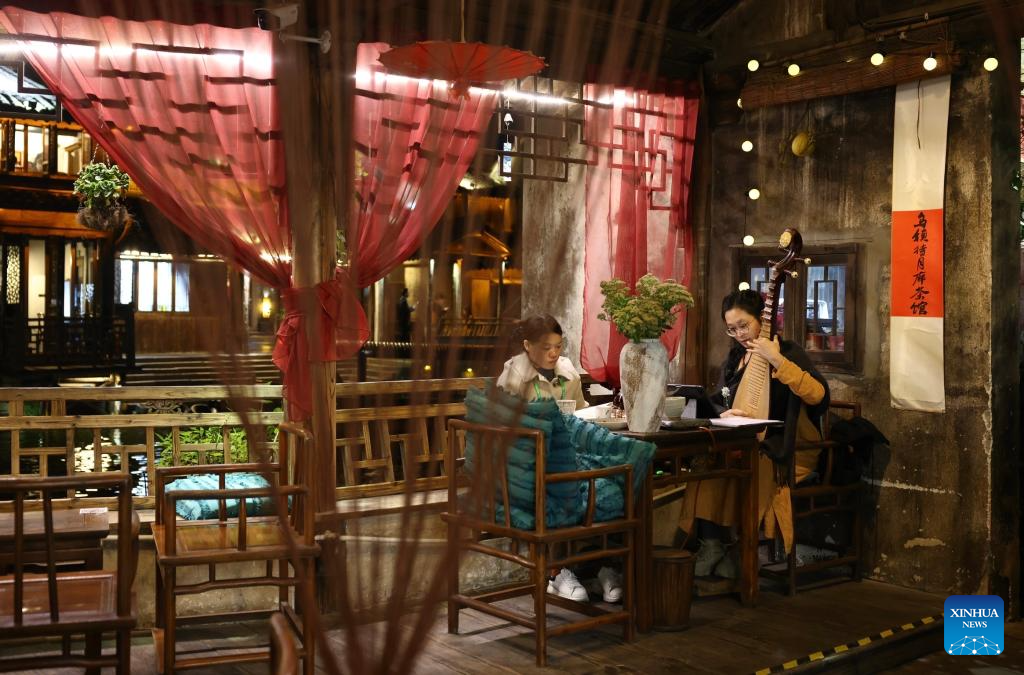 People chat over a cup of tea in Wuzhen, east China's Zhejiang Province, on Nov. 7, 2023. (Xinhua/Zhang Yuwei)