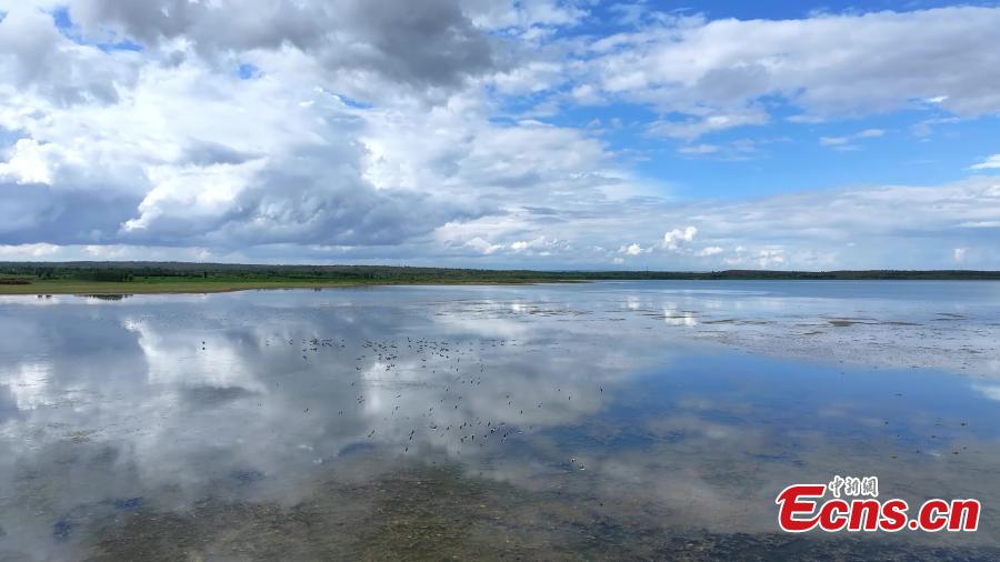 A flock of migratory birds fly over the lake of Hongjiannao National Nature Reserve in Shenmu, northwest China's Shaanxi Province. (Photo: China News Service/Liu Jiangang)