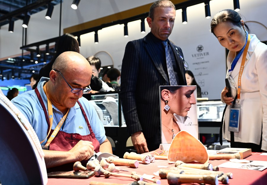 Ciro Esposito carves at the 6th China International Import Expo (CIIE) in east China's Shanghai, Nov. 6, 2023. Ciro Esposito, nearly 60 years old, was born in a carving family. (Xinhua/Jin Liangkuai)