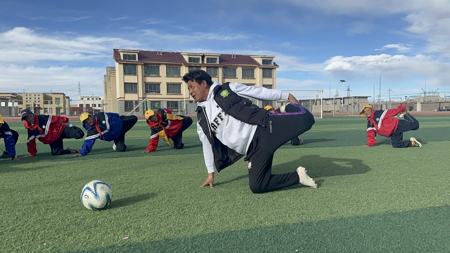 A teacher demonstrates as students do sports on the playground at the Baingoin County Sinopec Primary School in downtown Baingoin County, Nagqu, southwest China's Xizang Autonomous Region, Oct. 13, 2023. (Photo by Kong Linlin/Xinhua)