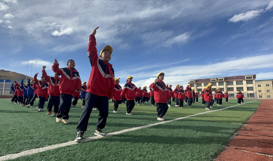 Students practice the "Xieqin," a traditional local dance, on the playground at the Baingoin County Sinopec Primary School in downtown Baingoin County, Nagqu, southwest China's Xizang Autonomous Region, Oct. 13, 2023. (Photo by Kong Linlin/Xinhua)