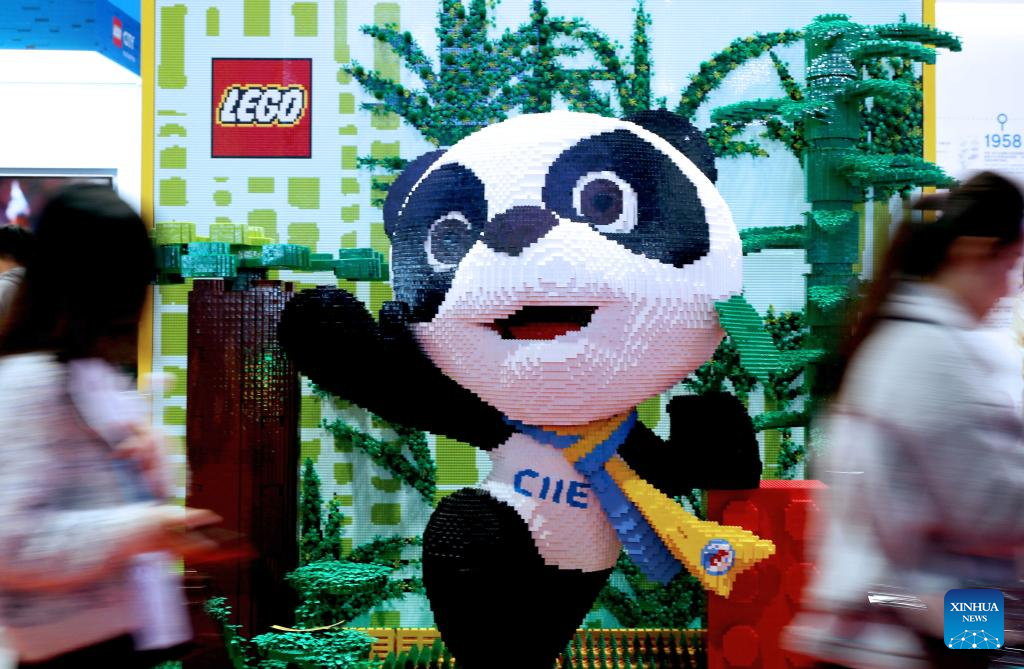 Toy products are displayed at the booth of Danish toy giant LEGO Group during the sixth China International Import Expo (CIIE) in Shanghai, east China, Nov. 6, 2023.?(Xinhua/Zhang Keren)