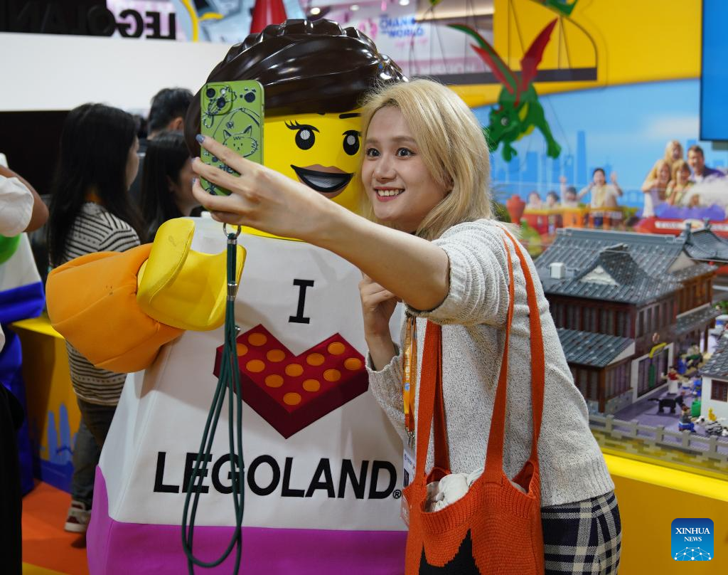 A visitor takes a selfie at the booth of Danish toy giant LEGO Group during the sixth China International Import Expo (CIIE) in Shanghai, east China, Nov. 7, 2023.?(Xinhua/Li Mengjiao)