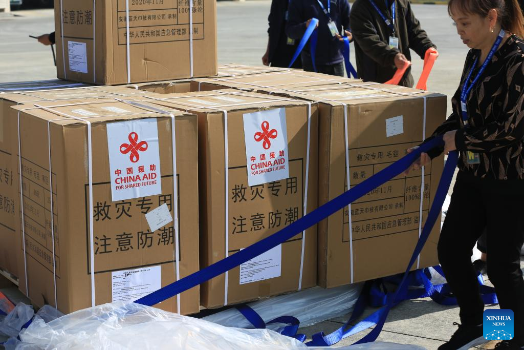 Chinese emergency relief materials for earthquake-hit areas are pictured at Pokhara International Airport in Pokhara, Nepal, Nov. 8, 2023. (Xinhua/Yi Aijun)