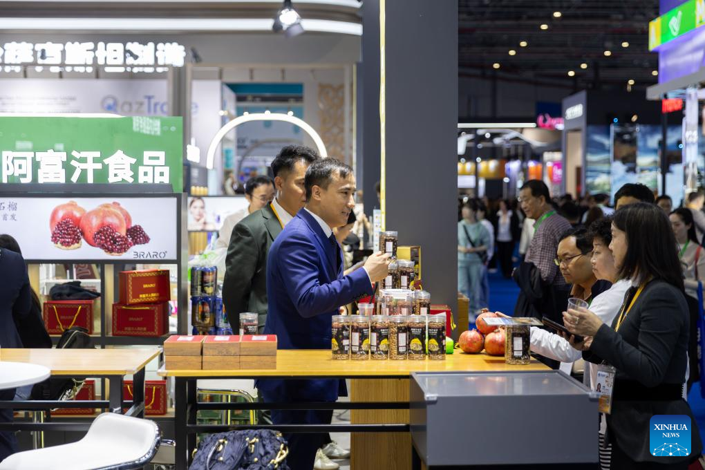 Visitors are attracted by Afghan food and agricultural products at the 6th China International Import Expo (CIIE) in east China's Shanghai, Nov. 6, 2023. (Xinhua/Wang Xiang)