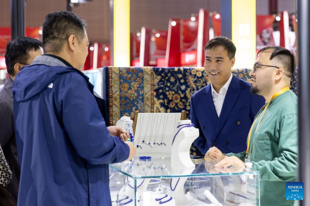 Ali Faiz (2nd R) introduces Afghan jewelry to visitors at the 6th China International Import Expo (CIIE) in east China's Shanghai, Nov. 6, 2023. (Xinhua/Wang Xiang)
