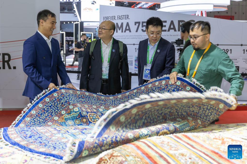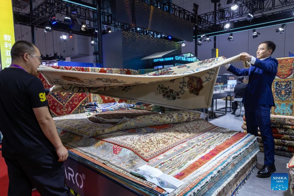 Ali Faiz (R) introduces Afghan carpets to a visitor at the 6th China International Import Expo (CIIE) in east China's Shanghai, Nov. 5, 2023. (Xinhua/Wang Xiang)