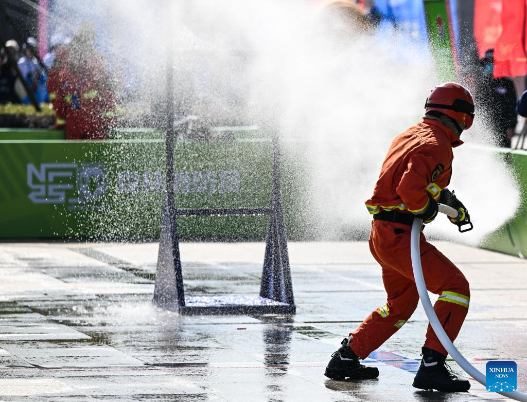 A forest firefighter competes in the national fire and rescue professional skill competition held in Nanjing, east China's Jiangsu Province, Nov. 8, 2023. A total of 343 firefighters from around the country competed in this skill competition on Wednesday. (Xinhua/Ji Chunpeng)