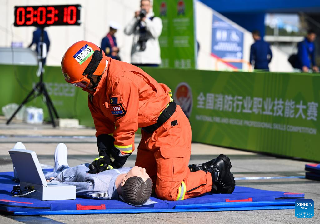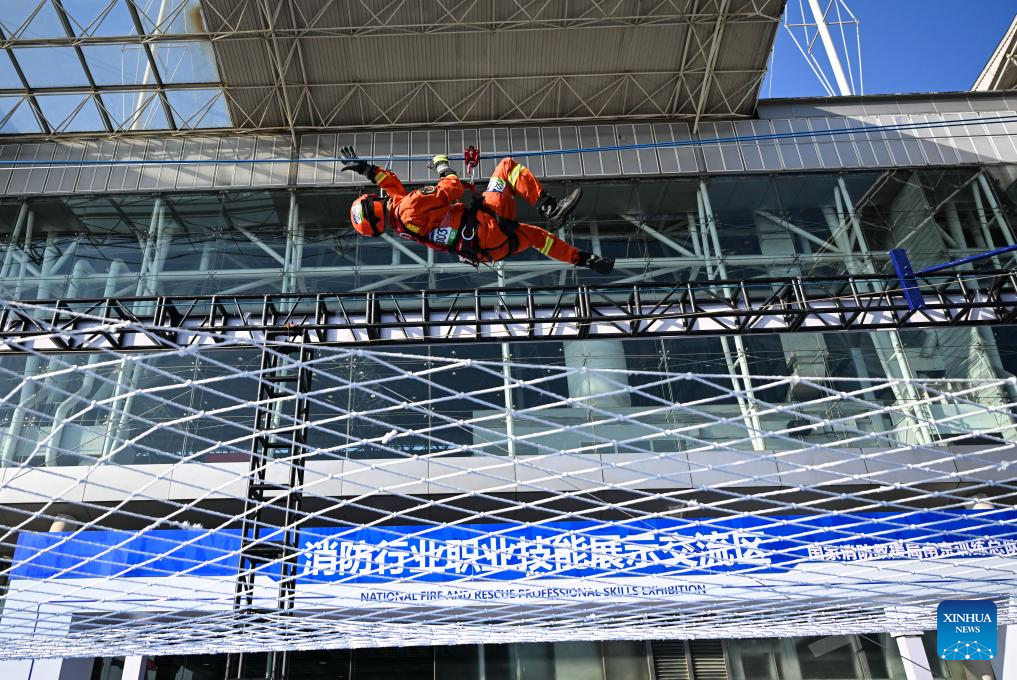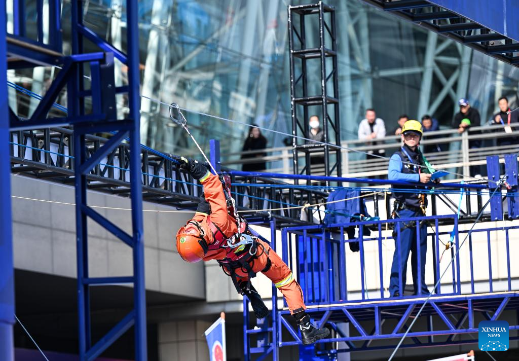 Firefighters compete in the national fire and rescue professional skill competition held in Nanjing, east China's Jiangsu Province, Nov. 8, 2023. A total of 343 firefighters from around the country competed in this skill competition on Wednesday. (Xinhua/Ji Chunpeng)