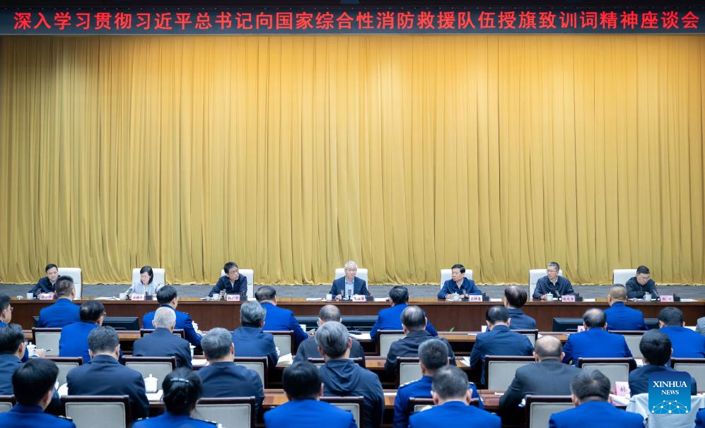 Chinese Vice Premier Zhang Guoqing, also a member of the Political Bureau of the Communist Party of China Central Committee, speaks at a symposium held by the Ministry of Emergency Management around the fifth anniversary of the China National Comprehensive Fire and Rescue Team's establishment, in Beijing, capital of China, Nov. 9, 2023. (Xinhua/Zhai Jianlan)