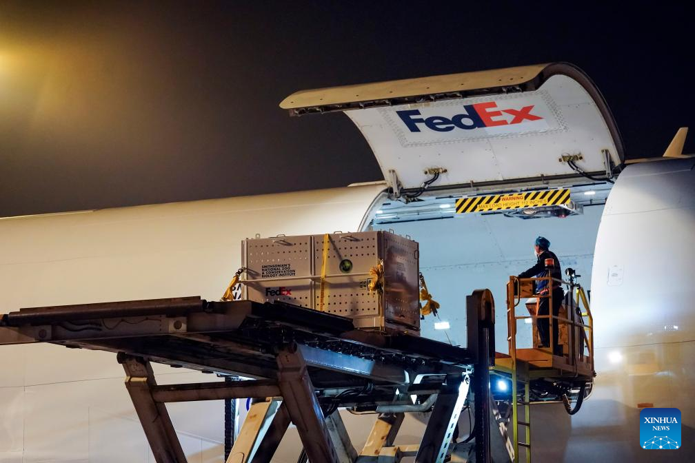 Giant pandas Mei Xiang, Tian Tian and their male cub, Xiao Qi Ji, arrives at the Chengdu Shuangliu International Airport in southwest China's Sichuan Province, Nov. 9, 2023, after wrapping up their stay in the United States. (Photo by Li Chuanyou/Xinhua)