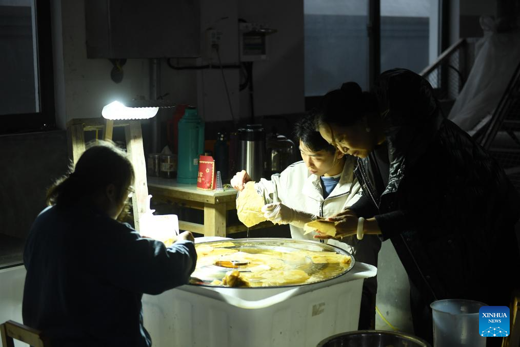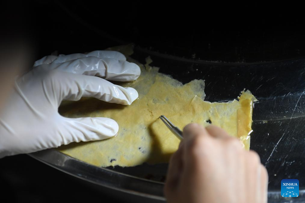 A worker removes impurities on paper at Huang Hongjian's studio in Kaihua County of Quzhou, east China's Zhejiang Province, Nov. 9, 2023. (Xinhua/Weng Xinyang)