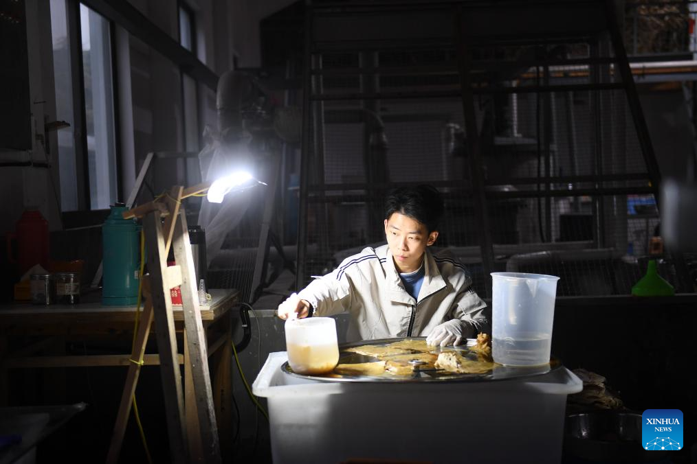 Huang Hongjian paints on a piece of paper he made at his studio in Kaihua County of Quzhou, east China's Zhejiang Province, Nov. 9, 2023. (Xinhua/Weng Xinyang)