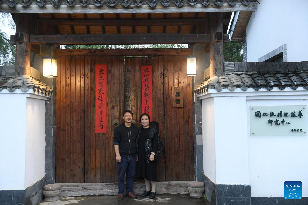 Huang Hongjian and his wife Lai Lifang pose for a photo at Huang's studio in Kaihua County of Quzhou, east China's Zhejiang Province, Nov. 9, 2023. (Xinhua/Weng Xinyang)