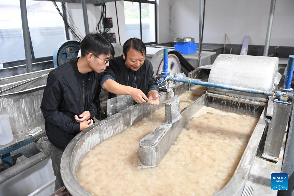 Huang Hongjian shows paper fibers at his studio in Kaihua County of Quzhou, east China's Zhejiang Province, Nov. 9, 2023. (Xinhua/Weng Xinyang)