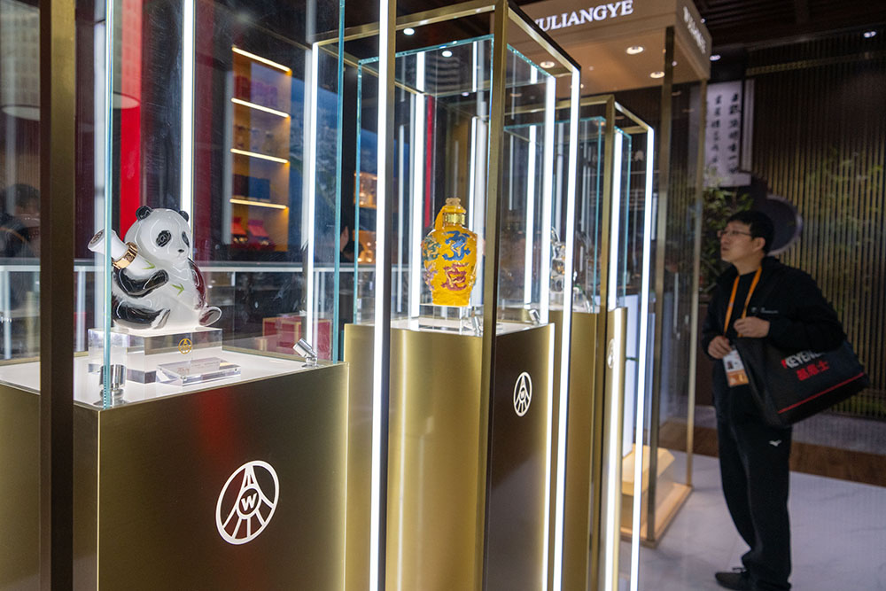 A visitor inspects a bottle of Baijiu (Chinese distilled spirit) at the booth of Wuliangye, a famous Chinese Baijiu company, during the sixth China International Import Expo (CIIE) in Shanghai. (People's Daily Online/Weng Qiyu)