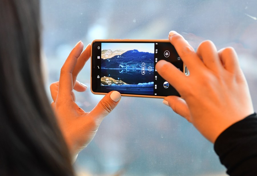 A Chinese tourist takes pictures of the scenery out of the window on the Zentralbahn from Lucerne to Interlaken, Switzerland, Feb. 14, 2023. (Xinhua/Lian Yi)