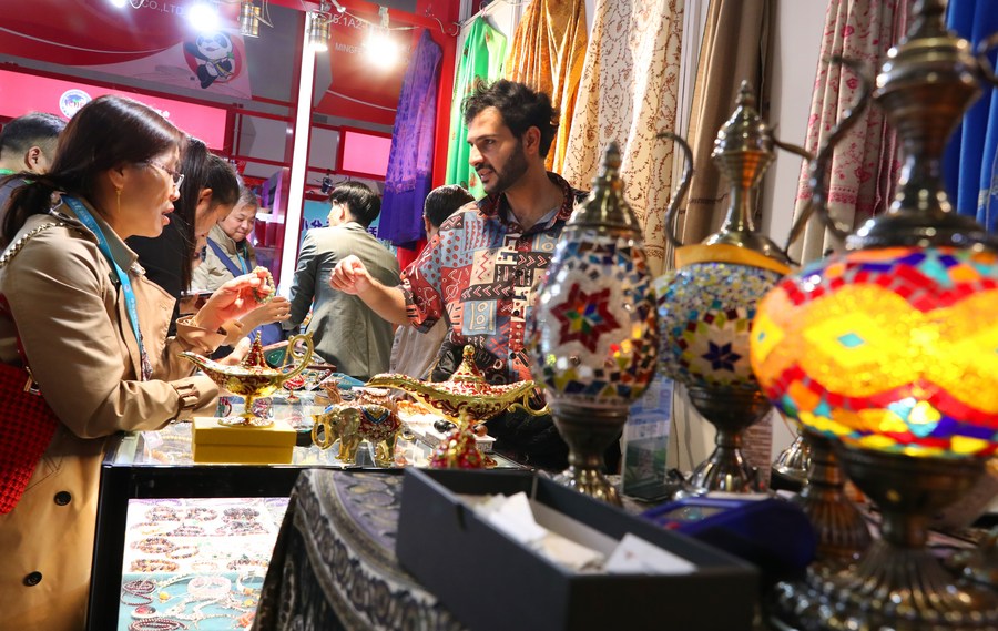 An exhibitor (R) from Yemen introduces handicrafts to visitors at the 6th China International Import Expo (CIIE) in east China's Shanghai, Nov. 10, 2023. (Xinhua/Fang Zhe)