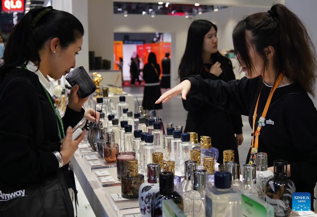 A visitor smells a Belgian candle at the 6th China International Import Expo (CIIE) in east China's Shanghai, Nov. 9, 2023. (Xinhua/Li Mengjiao)