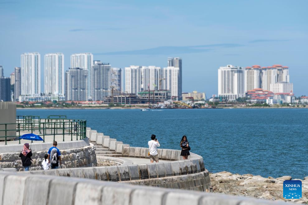 People go sightseeing on a waterside walkway in Penang, Malaysia, Nov. 8, 2023. (Photo by Chong Voon Chung/Xinhua)