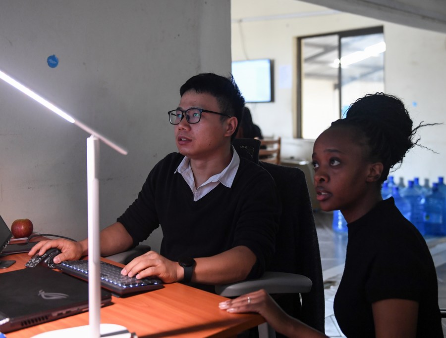 A Chinese staff member and a Kenyan staff member of Kilimall work at an office in Mlolongo, Kenya, Nov. 10, 2023. (Photo by Li Yahui/Xinhua)