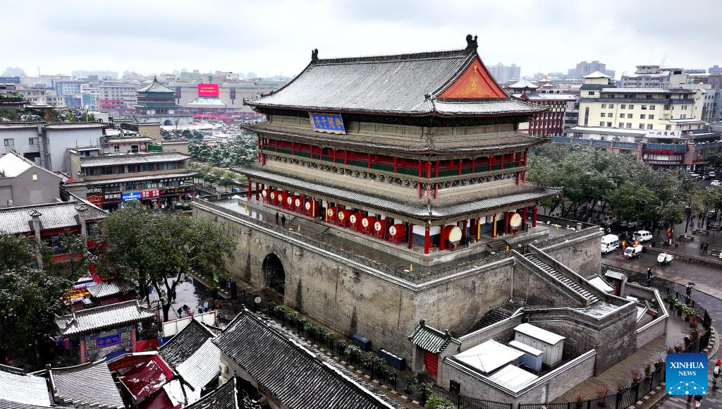 This aerial photo taken on Nov. 11, 2023 the view of snow-covered Bell Tower in Xi'an, northwest China's Shaanxi Province. Xi'an witnessed a snowfall on Saturday, the first one after traditional solar term of Lidong, which means the beginning of winter and fell on Nov. 8 this year. (Xinhua/Liu Xiao)